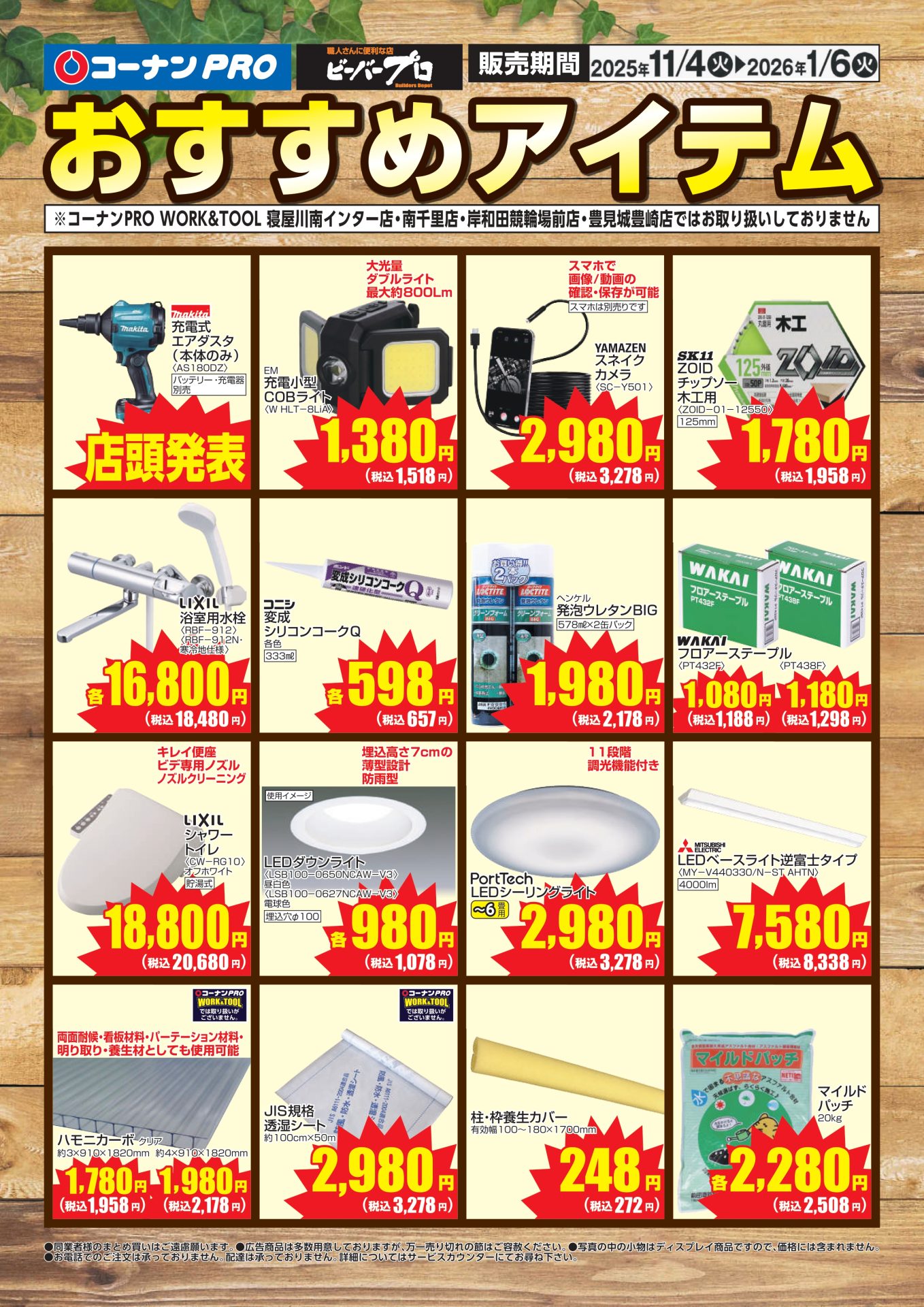 2025.11.3チラシ コ-ナンPRO おすすめアイテム! 2026年1月6日まで ※一部の店舗を除きます 対象店舗 PRO 全店 コーナンPRO、ビーバープロ 各店舗にて販売中!※ コ-ナンPRO WORK&TOOL店では、一部商品の取扱いがございません。※ PRO豊見城豊崎店は取り扱い商品が異なりますので、こちらをご確認ください。※ こちらのチラシは、下記3店舗は対象外となります。 コ-ナンPRO WORK&TOOL寝屋川南インター店 コ-ナンPRO WORK&TOOL南千里店 コ-ナンPRO WORK&TOOL 岸和田競輪場前店 PDF はこちら カテゴリー 提携サービス 1 チラシ 6 イベント 7 商品紹介 19 リニューアル店 1 お知らせ 10 次のページ « 一覧ページへ戻る
