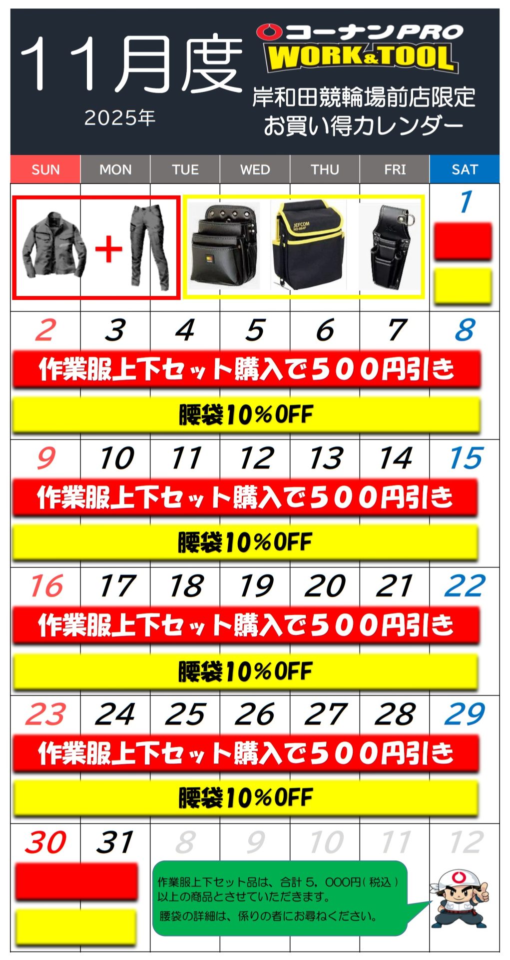 2025.10.31イベント PRO WORK&TOOL 岸和田競輪場前店 限定! 11月お買い得カレンダー 対象店舗 WORK&TOOL 岸和田競輪場前店 カテゴリー 提携サービス 1 チラシ 2 イベント 6 商品紹介 18 リニューアル店 1 お知らせ 10 前のページ次のページ « 一覧ページへ戻る