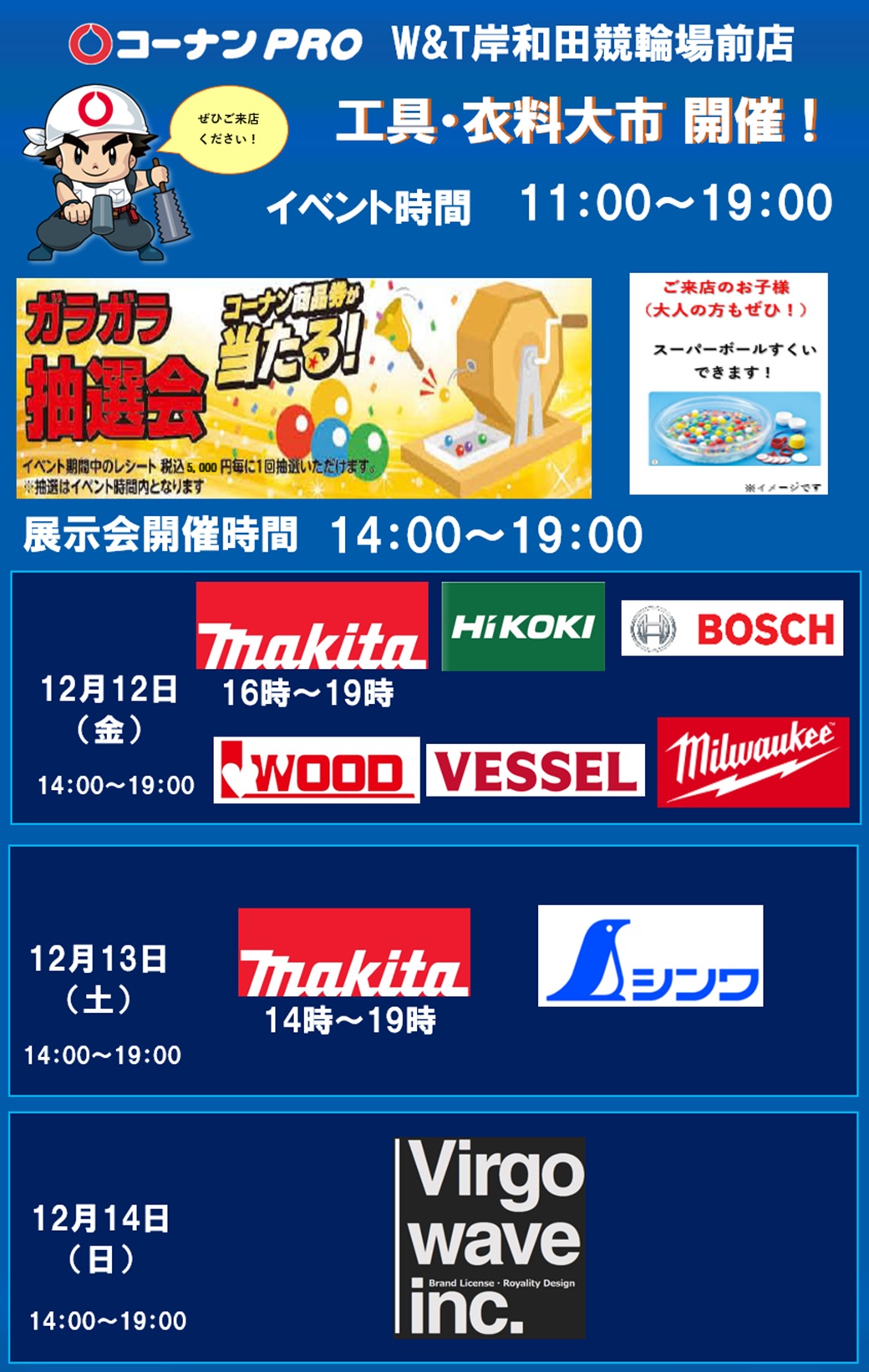2025.12.5イベント PRO WORK&TOOL 岸和田競輪場前店 工具・衣料大市 開催! 対象店舗 WORK&TOOL 岸和田競輪場前店 カテゴリー 提携サービス 1 チラシ 3 イベント 4 商品紹介 20 リニューアル店 1 キャンペーン 2 お知らせ 10 前のページ « 一覧ページへ戻る