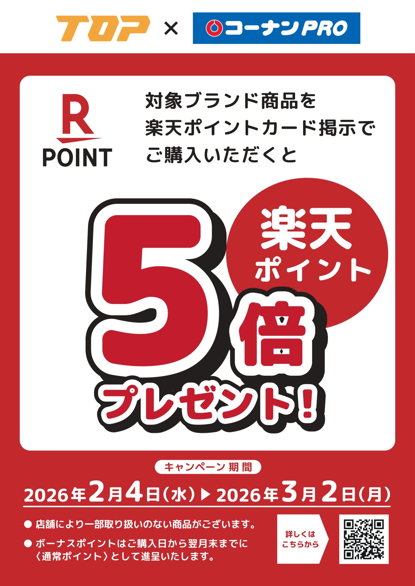 2026.2.3キャンペーン 楽天ボーナス5倍 TOP工業ブランド商品 2026年3月2日まで 対象店舗 PRO 全店 ※ こちらのキャンペーンは、下記3店舗は対象外となります。 コ-ナンPRO 福島大開店 コ-ナンPRO 米子河崎店 コ-ナンPRO 江戸川船堀店 対象商品はこちら カテゴリー 提携サービス 1 チラシ 2 商品紹介 16 キャンペーン 1 お知らせ 10 « 一覧ページへ戻る