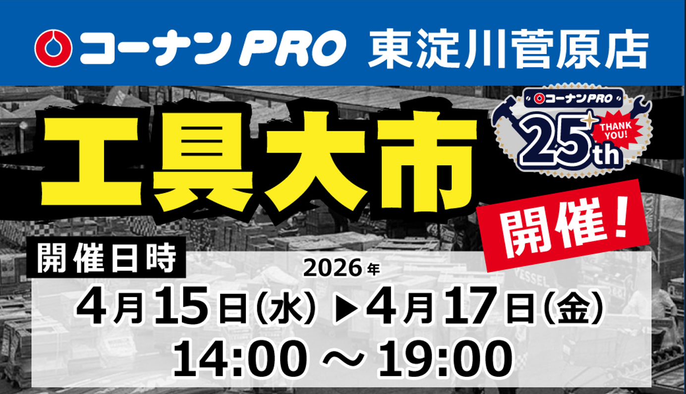 2026.4.1イベント PRO東淀川菅原店 メーカー展示即売会 開催! 4月15日~17日の3日間 対象店舗 東淀川菅原店 カテゴリー 提携サービス 1 チラシ 2 イベント 2 商品紹介 17 リニューアル店 1 キャンペーン 2 お知らせ 11 前のページ « 一覧ページへ戻る